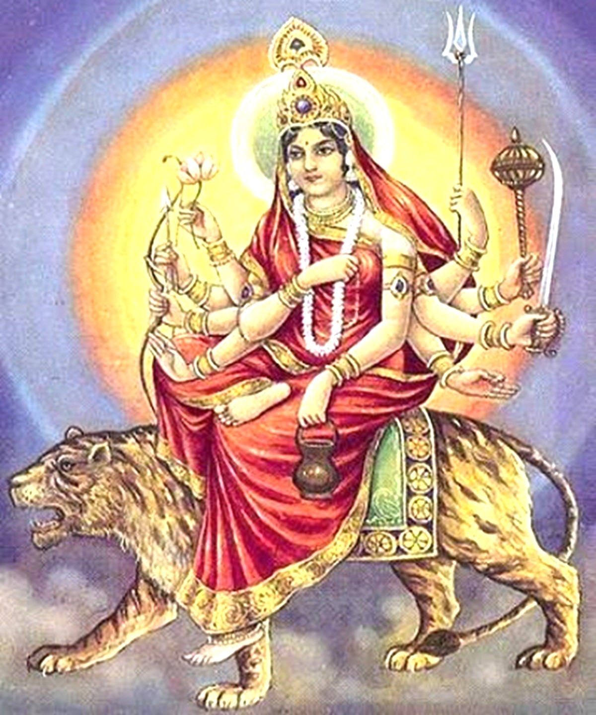 नवरात्रि के तीसरे दिन पूजित होने वाली माँ चंद्रघंटा शक्ति और शौर्य की देवी मानी जाती हैं। उनके मस्तक पर अर्धचंद्र के आकार की घंटा सुशोभित रहती है, इसी कारण उन्हें चंद्रघंटा कहा जाता है। उनका शरीर स्वर्ण के समान दीप्तिमान है और उनके दस भुजाएँ हैं। वे त्रिशूल, गदा, तलवार, धनुष-बाण, कमल आदि अस्त्र-शस्त्र धारण करती हैं तथा एक हाथ अभय मुद्रा में रहता है। यह स्वरूप भक्तों को निडर और पराक्रमी बनाता है।