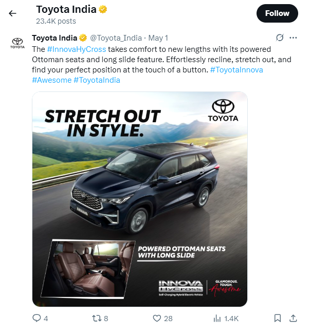 चार पहिया वाहन निर्माता टोयोटा-किर्लोस्कर मोटर ने भारत में इनोवा हाइक्रॉस (Innova Hycross) का एक्सक्लूसिव एडिशन लॉन्च कर दिया है।