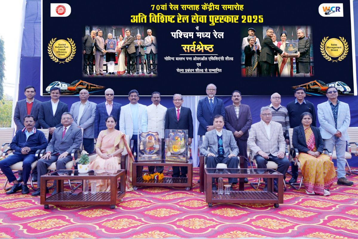 सोमवार 12 जनवरी 2026 को पश्चिम मध्य रेल मुख्यालय में महाप्रबंधक श्रीमती शोभना बंदोपाध्याय ने ओवरऑल दक्षता शील्ड (गोविन्द बल्लभ पंत) एवं बिक्री प्रबंधन शील्ड प्राप्त होने की इस महत्वपूर्ण उपलब्धि पर पश्चिम मध्य रेल के प्रमुख मुख्य विभागाध्यक्षों सहित सभी रेल अधिकारियों एवं कर्मचारियों को बधाई एवं शुभकामनाएँ दी।