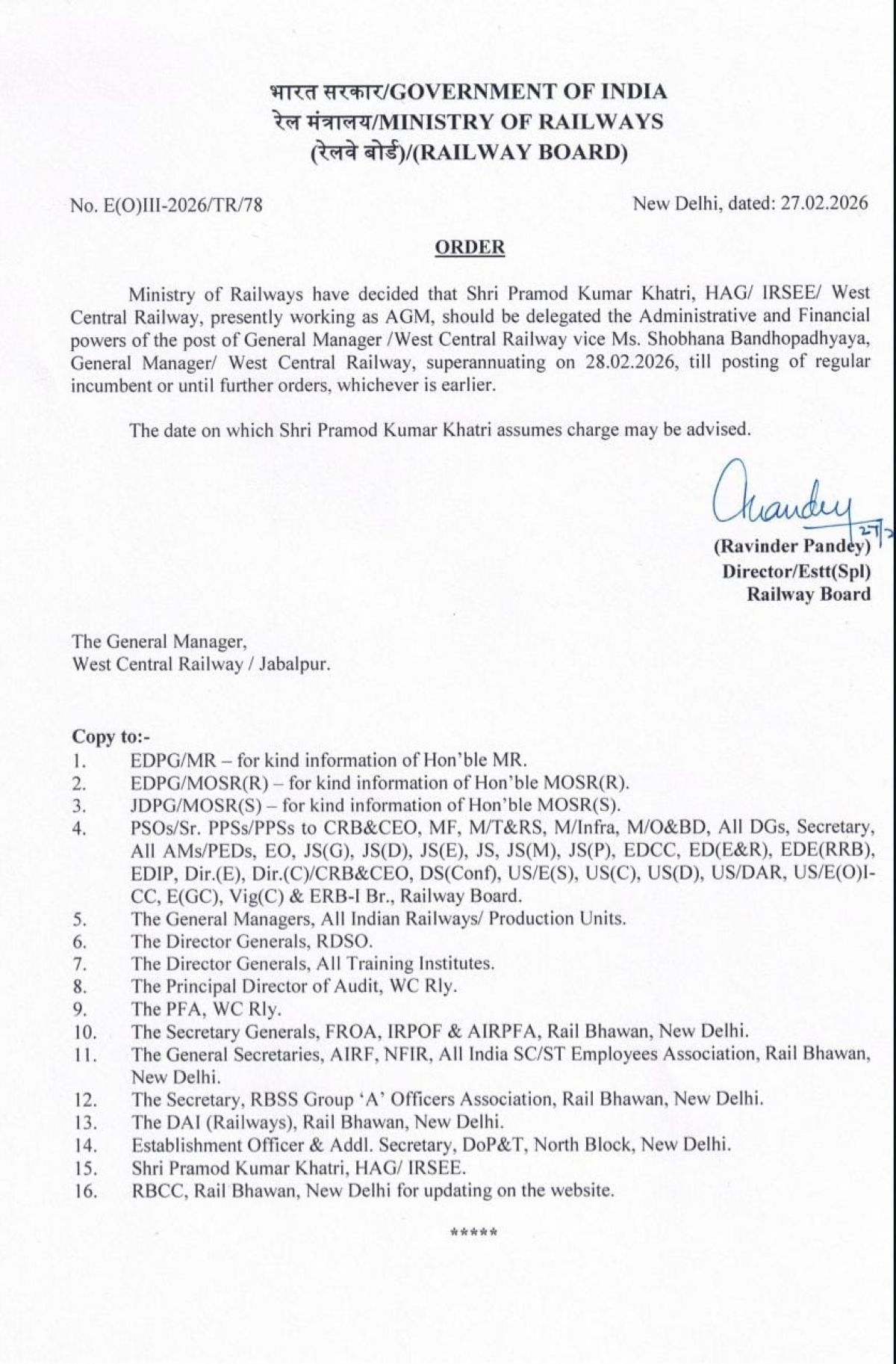 रेलवे बोर्ड द्वारा जारी आदेश में कहा गया है कि पमरे की जीएम श्रीमती शोभना बंदोपाध्याय जो आगामी 28 फरवरी को सेवानिवृत्त हो रही हैं. उनके स्थान पर पमरे में एजीएम के पद पर पदस्थ प्रमोद कुमार खत्री को कार्यकारी जीएम पमरे नियुक्त किया जाता है, उन्हें महाप्रबंधक की समस्त शक्त्यिां प्राप्त होंगी. ये नियुक्ति नियमित जीएम की पदस्थापना तक होगी.
