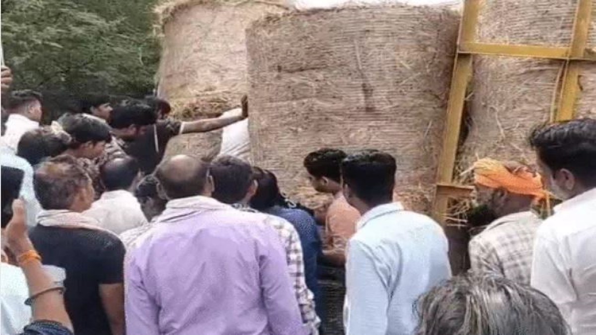 घास से लोड ट्रेक्टर-ट्राली अनियंत्रित होकर पलटी