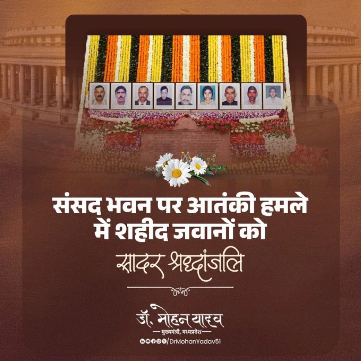 मुख्यमंत्री डाॅ. यादव ने साेशल मीडिया एक्स पर अपने संदेश में कहा संसद भवन पर आतंकी हमले में शहीद जवानों को सादर श्रद्धांजलि अर्पित करता हूं।