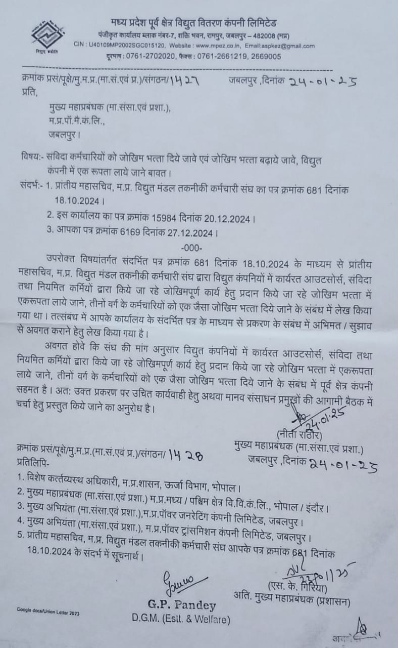 जिस पर पावर मैनेजमेंट कंपनी ने पूर्व क्षेत्र विद्युत वितरण कंपनी से अभिमत/सुझाव मांगा था। अपने प्रत्युत्तर में पूर्व क्षेत्र विद्युत वितरण कंपनी के मानव संसाधन एवं प्रशासन विभाग ने लिखा कि प्रांतीय महासचिव, मप्र विद्युत मंडल तकनीकी कर्मचारी संघ द्वारा विद्युत कंपनियों में कार्यरत आउटसोर्स, संविदा तथा नियमित कर्मियों द्वारा किये जा रहे जोखिमपूर्ण कार्य हेतु प्रदान किये जा रहे जोखिम भत्ता में एकरूपता लाये जाने, तीनों वर्ग के कर्मचारियों को एक जैसा जोखिम भत्ता दिये जाने के संबंध में लेख किया गया था। तत्संबंध में आपके कार्यालय के संदर्भित पत्र के माध्यम से प्रकरण के संबंध में अभिमत/सुझाव से अवगत कराने हेतु लेख किया गया है।