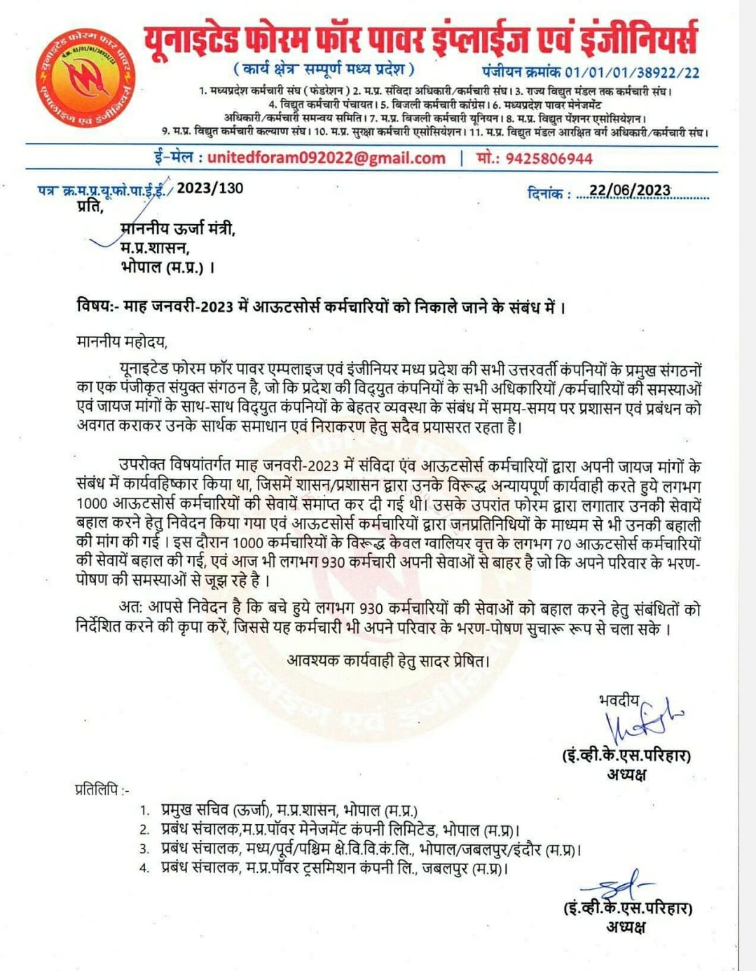 मध्य प्रदेश यूनाइटेड फोरम फॉर पावर एम्पलाइज एवं इंजीनियर के अध्यक्ष व्हीकेएस परिहार ने प्रदेश के ऊर्जा मंत्री को पत्र लिखकर मांग की है कि इस साल जनवरी महीने में कार्य बहिष्कार आंदोलन करने पर लगभग 1000 आऊटसोर्स कर्मचारियों की सेवायें समाप्त कर दी गई थी। नौकरी से हटाए जाने के बाद इन कर्मचारियों पर आर्थिक संकट आ गया है और उन्हें अपने परिवार का भरण-पोषण करने में खासी परेशानियों का सामना करना पड़ रहा है।