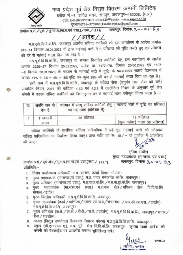 जारी आदेश के अनुसार कंपनी के अधिकारियों एवं कर्मचारियों को 1 जनवरी 2023 से सातवें वेतनमान में 4 प्रतिशत की वृद्धि करते हुये कुल 38 प्रतिशत की दर से मंहगाई भत्ता दिया जायेगा। इसके साथ ही मध्य प्रदेश पूर्व क्षेत्र विद्युत वितरण कंपनी ने 1 जनवरी 2023 से अपने संविदा अधिकारियों एवं कर्मचारियों के महंगाई भत्ते में 18 प्रतिशत की वृद्धि कर दी है। अभी संविदा अधिकारियों एवं कर्मचारियों को 20 प्रतिशत की दर से महंगाई भत्ता दिया जा रहा था, इस वृद्धि के बाद महंगाई भत्ता 38 प्रतिशत हो जायेगा।