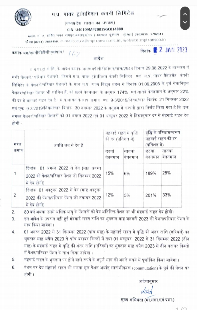पावर ट्रांसमिशन कंपनी ने अपने आदेश में कहा है कि कंपनी द्वारा निर्णय लिया गया है कि प्रदेश शासन के आदेशानुसार उक्त समस्त पेंशनरों अथवा परिवार पेंशनरों को 1 अगस्त 2022 से छटवें वेतनमान के अनुसार 189 प्रतिशत एवं सातवें वेतनमान के अनुसार 28 प्रतिशत की दर से मंहगाई राहत को दी जाएगी। वहीं 1 अक्टूबर 2022 से छटवें वेतनमान के अनुसार 201 प्रतिशत एवं सातवें वेतनमान के अनुसार 33 प्रतिशत की दर से मंहगाई राहत को दी जाएगी।