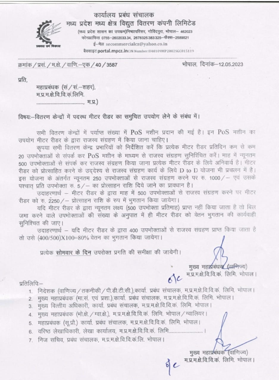 मध्य क्षेत्र विद्युत वितरण कंपनी ने आपने सर्कुलर में कहा है कि सभी वितरण केन्द्रों में पर्याप्त संख्या में POS मशीन प्रदान की गई है। इन POS मशीन का उपयोग मीटर रीडर के द्वारा राजस्व संग्रहण में किया जाना चाहिए। कंपनी ने कहा है कि सभी वितरण केन्द्र प्रभारी प्रत्येक मीटर रीडर प्रतिदिन कम से कम 20 उपभोक्ताओं से संपर्क कर POS मशीन के माध्यम से राजस्व संग्रहण सुनिश्चित करें। माह में न्यूनतम 500 उपभोक्ताओं से संपर्क कर राजस्व संग्रहण किया जाना प्रत्येक मीटर रीडर के लिये अनिवार्य है।