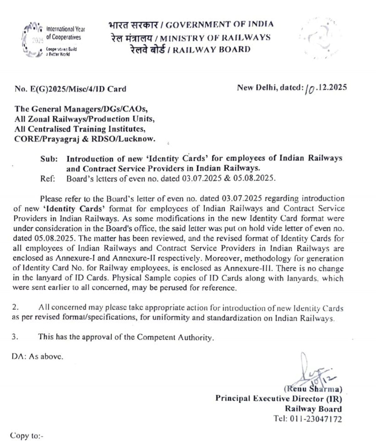 जबलपुर. अब देशभर के रेलवे कर्मचारियों और संविदा पर नियुक्त कर्मचारियों को एक नया पहचान पत्र जारी किया जाएगा। रेलवे बोर्ड के प्रधान कार्यकारी निदेशक रेणु शर्मा ने सभी जोन को इसके लागू करने का आदेश दे दिया है।