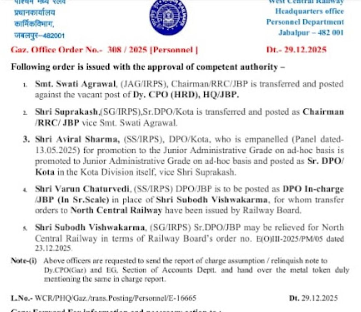 जबलपुर रेल जोन में कई अधिकारियों के हुए तबादले ,वरुण चतुर्वेदी को सीडीपीओ का प्रभार, यहां देखे पूरी डिटेल