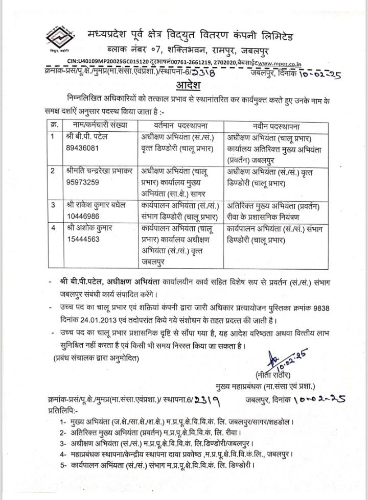 पूर्व क्षेत्र विद्युत वितरण कंपनी की सीजीएम-एचआर नीता राठौर द्वारा जारी आदेश में कहा गया है कि प्रबंध संचालक के अनुमोदन पर बीपी पटेल अधीक्षण अभियंता (सं./सं.) वृत्त डिण्डोरी (चालू प्रभार) को अधीक्षण अभियंता (चालू प्रभार) कार्यालय अतिरिक्त मुख्य अभियंता (प्रवर्तन) जबलपुर स्थानांतरित किया जाता है।