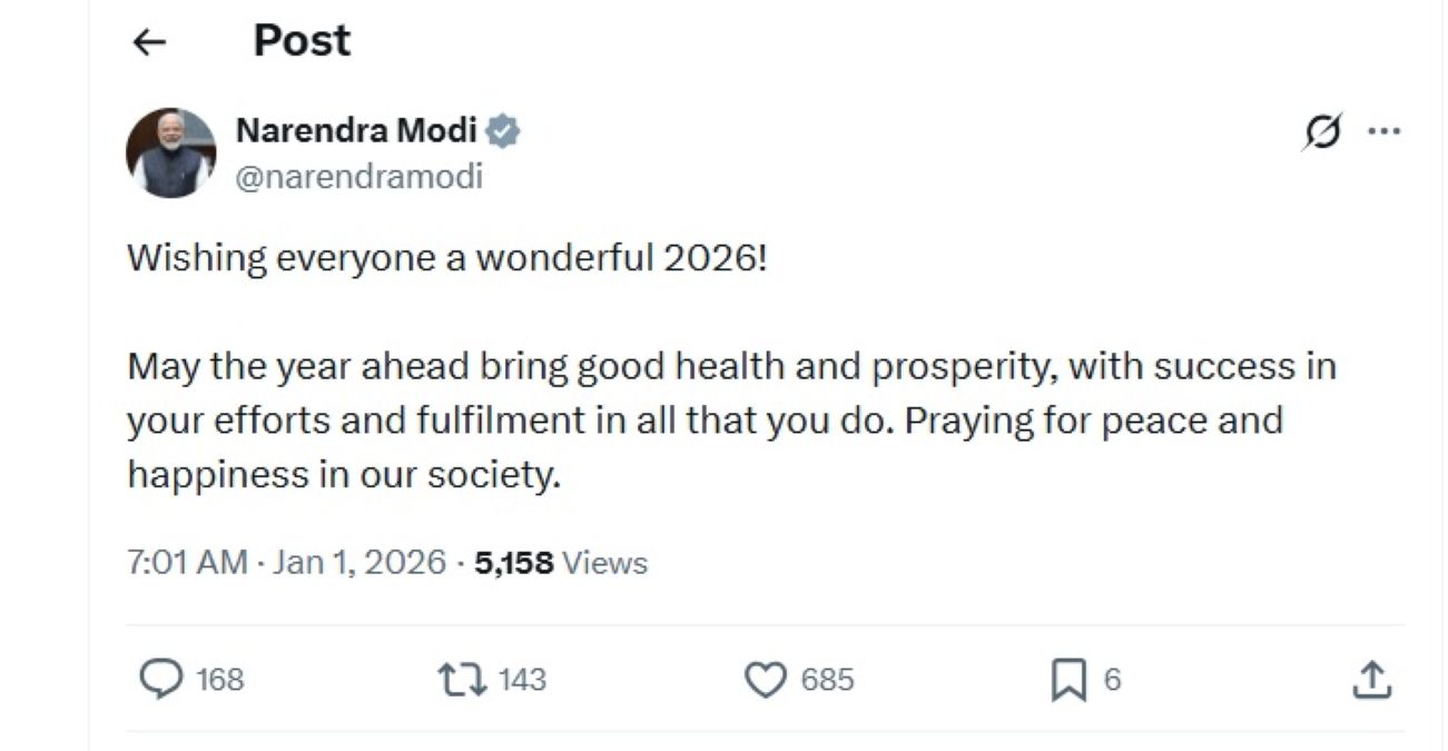 उन्होंने एक्स पर लिखा, ” सभी को 2026 की बहुत-बहुत शुभकामनाएं! प्रधानमंत्री मोदी ने कहा कि आने वाला साल आपके लिए अच्छा स्वास्थ्य और समृद्धि लाए।